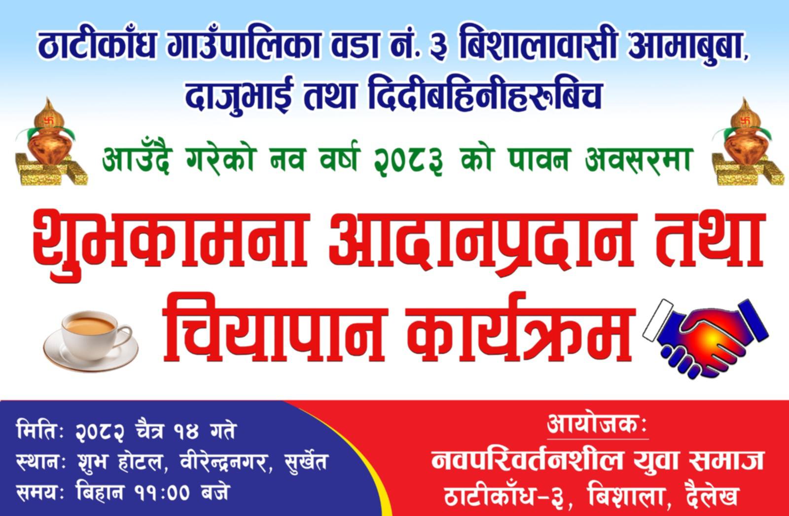सुर्खेत — ठाटीकाँध गाउँपालिका वडा नं. ३ विशाला दैलेखका स्थानीय आमाबुबा, दाजुभाइ तथा दिदीबहिनीहरूबीच नयाँ वर्ष २०८३ को पावन अवसरमा शुभकामना आदानप्रदान तथा चियापान कार्यक्रम आयोजना गरिने भएको छ। नव वर्षको स्वागतसँगै आपसी सद्भाव, एकता र भाइचाराको भावना अभिवृद्धि गर्ने उद्देश्यले ..