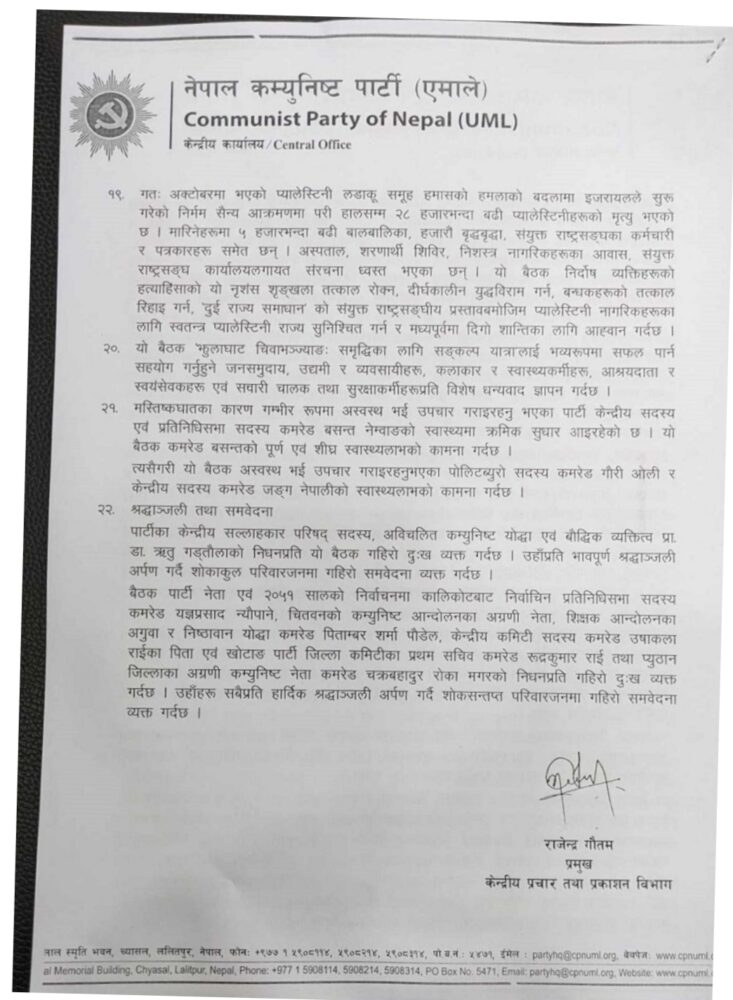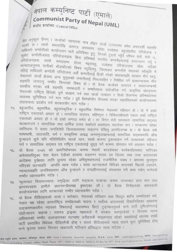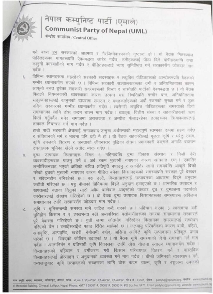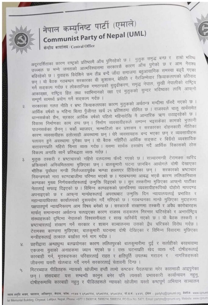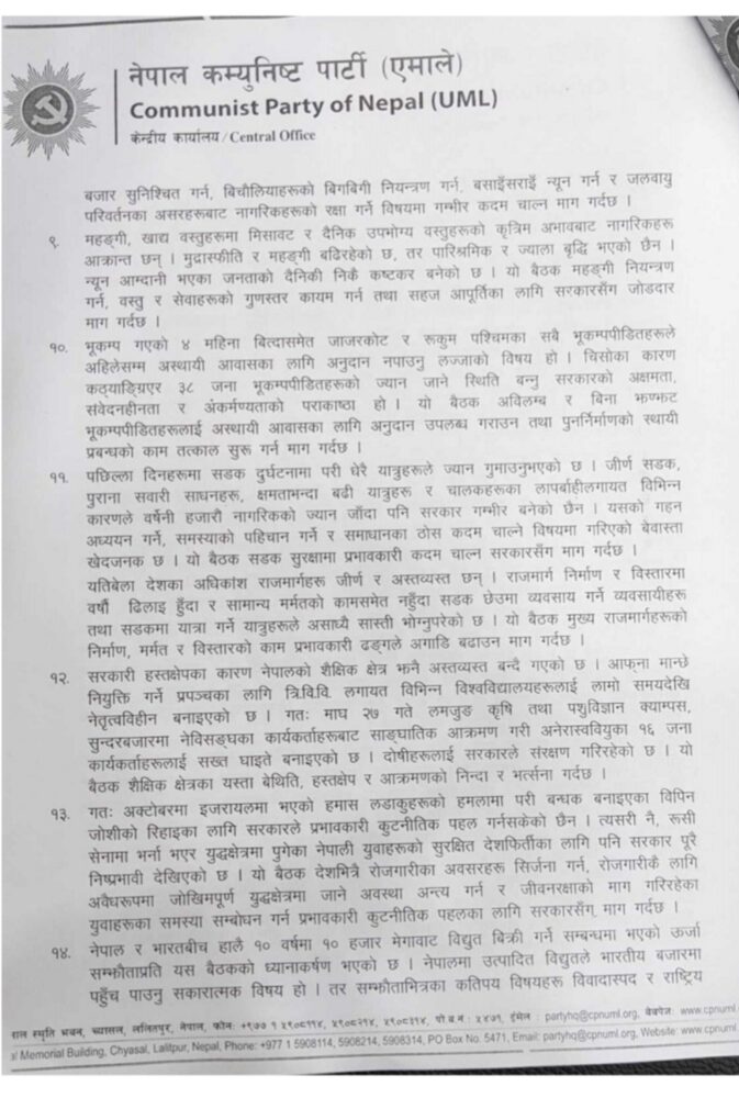 एमालेले मिटरब्याजी र सहकारी पीडितका समस्या तत्काल समाधान गर्न पनि सरकारसँग आग्रह गरेको छ । सडक दुर्घटना बढ्दा सरकारले चासो नदिएको, शिक्षा क्षेत्रमा सरकारको हस्तक्षेप उदाङ्गो भएको, सरकार कूटनीतिक मामिलामा चुकेको एमालेको निष्कर्ष छ ।