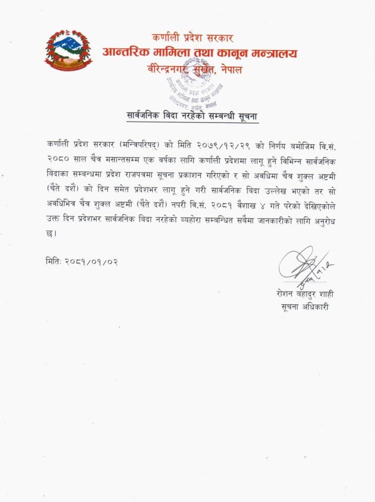 सुर्खेत: यो वर्ष चैते दसैँ वैशाखमा परेपछि प्रदेश सरकारले सार्वजनिक बिदा नदिने भएको छ।