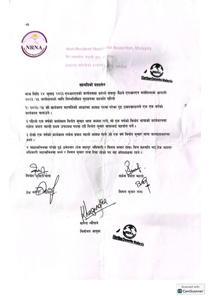 गत २०२३ जुलाई २४ मा बसेकाे संयुक्त बैठकले एनआरएनए मलेसियाकाे आगामि २०२३/ २५ कार्यकालकालागी सहमतिका आधारमा अध्यक्ष पदमा परेका दुई उमेदवारहरूले एक,एक बर्षकाे कार्यकाल चलाउने सहमति भएकाे थियाे ।