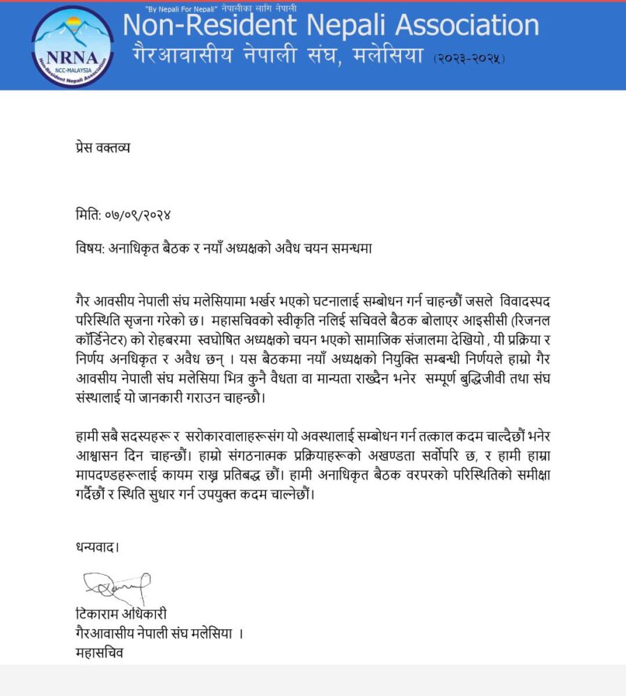 मलेसिया । गैर आवासीय नेपाली संघ (NRNA) मलेसियाका महाँसचिव टिकाराम अधिकारीले आफ्नाे स्वीकृत नलिकन सचिवले अनाधिकृत बैठक बसाली नयाँ स्वघाेसित अध्यक्षकाे चयन गरेकाे भन्दै आपत्ति सहित प्रेस वक्तब्य जारी गरेका छन ।
