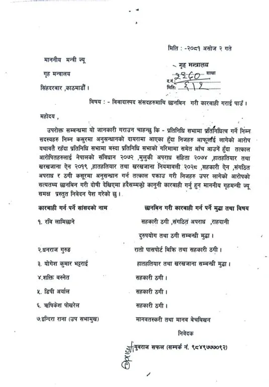 प्रतिनिधि सभाका उपसभामुख इन्दिरा रानासहित सात जना विरुद्ध गृह मन्त्रालयमा उनले बुधबार उजुरी दिएका हुन् । सफलले उपसभामुख रानासँगै सांसदहरू रवि लामिछाने, डीपी अर्याल, धनराज गुरुङ, शक्ति बस्नेत, योगेश भट्टराई र ऋषिकेश पोखरेलविरुद्ध गृह मन्त्रालयमा उजुरी दिएका हुन् ।