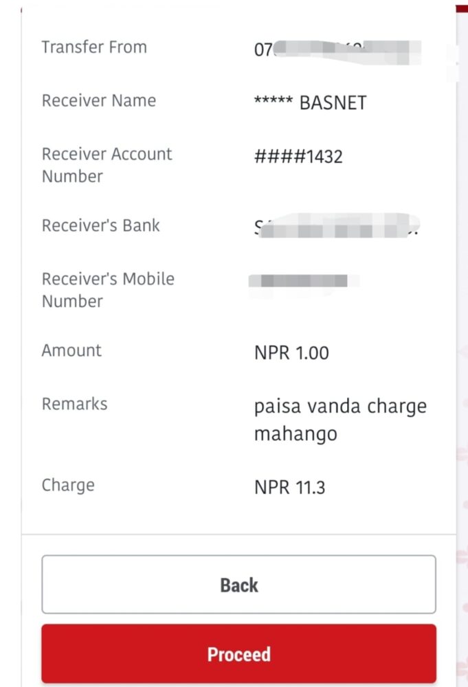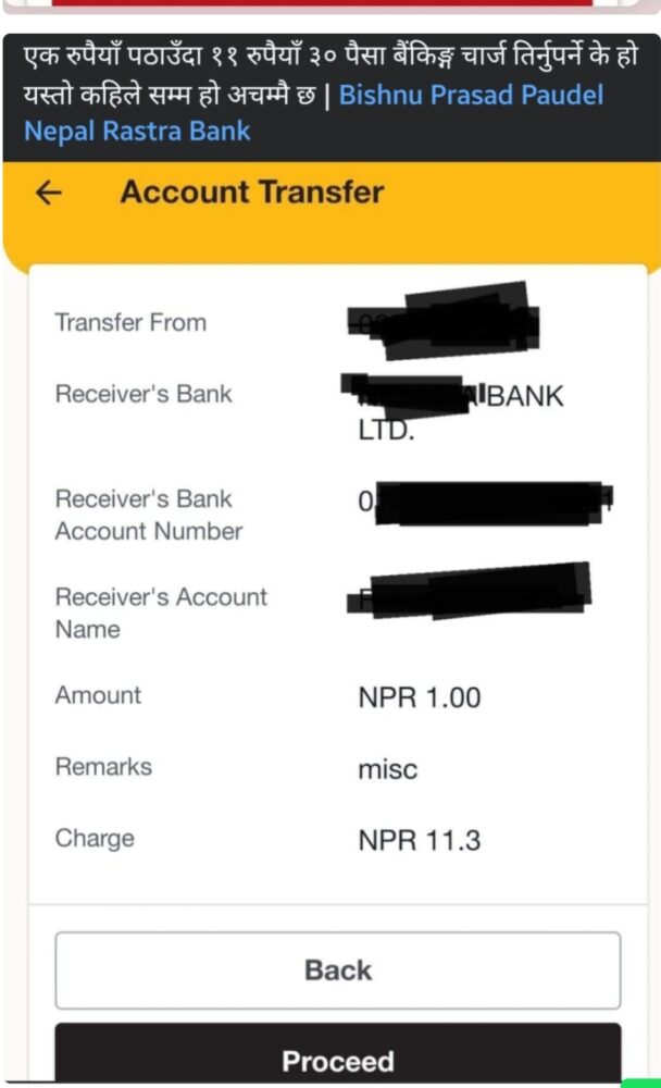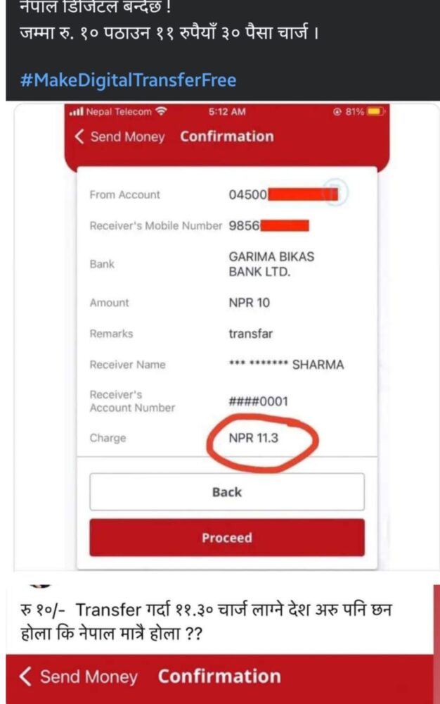 एक रुपैयाँ पठाउँदा ११.३० रुपैयाँ अतिरिक्त शुल्क तिर्नु परेको भन्दै सामाजिक सञ्चालमा चर्को आलोचना भइरहेको छ । एउटा बैंकबाट अर्को बैंकमा रकम ट्रान्सफर गर्दा १० रुपैयाँ सेवाशुल्क लाग्ने व्यवस्था छ । भने, सेवा शुल्कको १३ प्रतिशत रकम करवापत जोडिन्छ ।