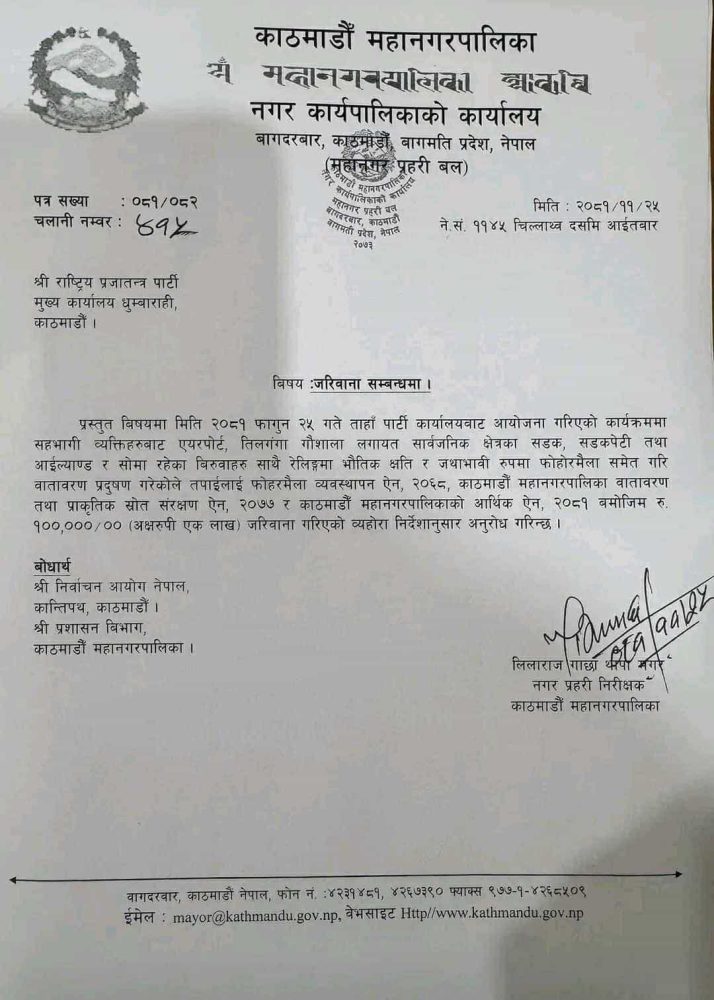 महानगरपालिकाले जरिवाना तिर्न राप्रपाको केन्द्रीय कार्यालयलाई आइतबार नै पत्राचार गरेको छ।