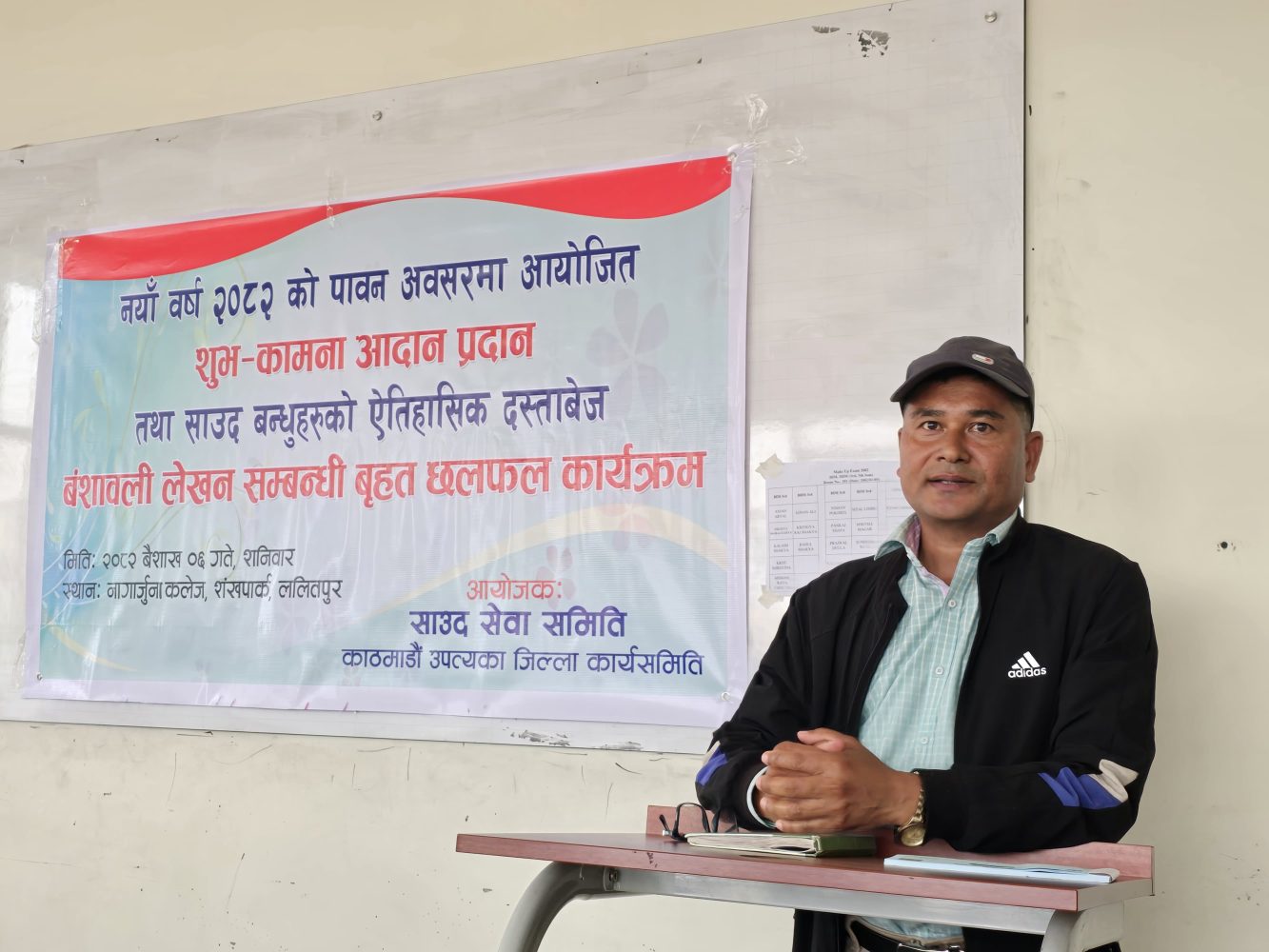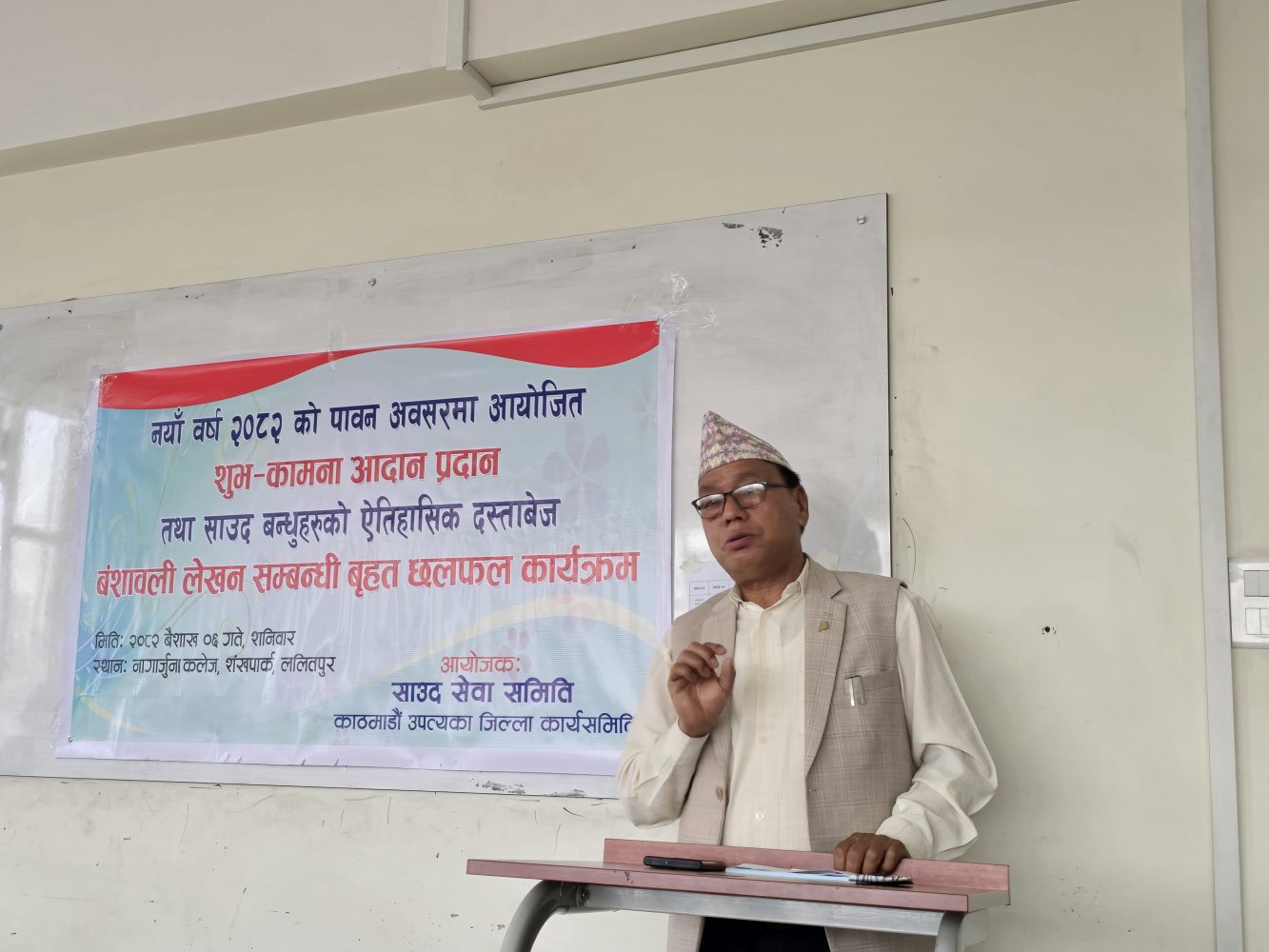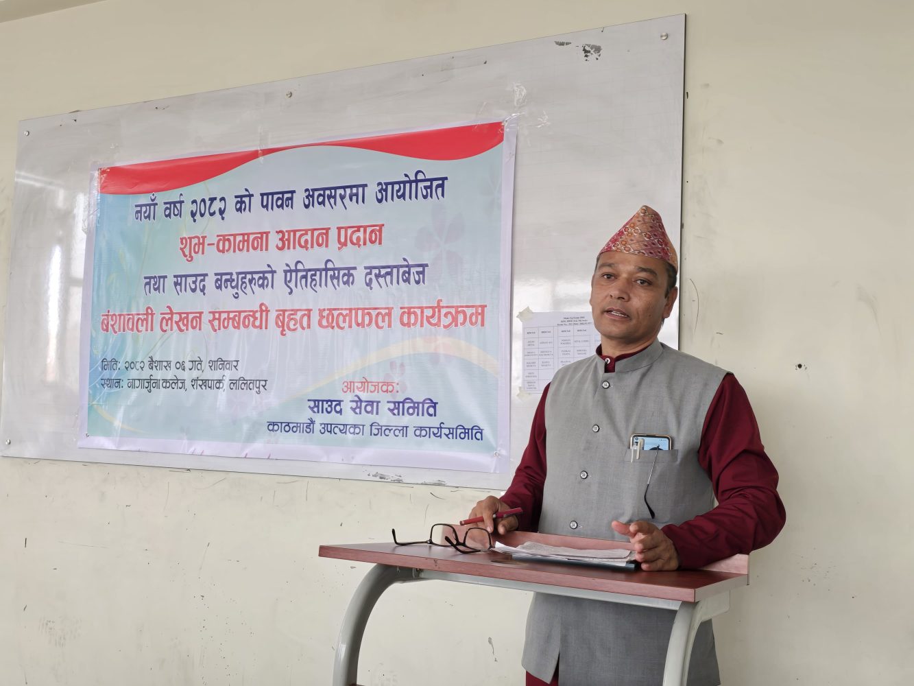 ललितपुरको शंखपार्क स्थित नागार्जुना कलेजमा सम्पन्न कार्यक्रमको संचालन साउद सिवा समिति काठमाडौ उपत्यका जिल्ला कार्यसमितिका सचिव रुपेश साउदले गर्नुभएको थियो ।