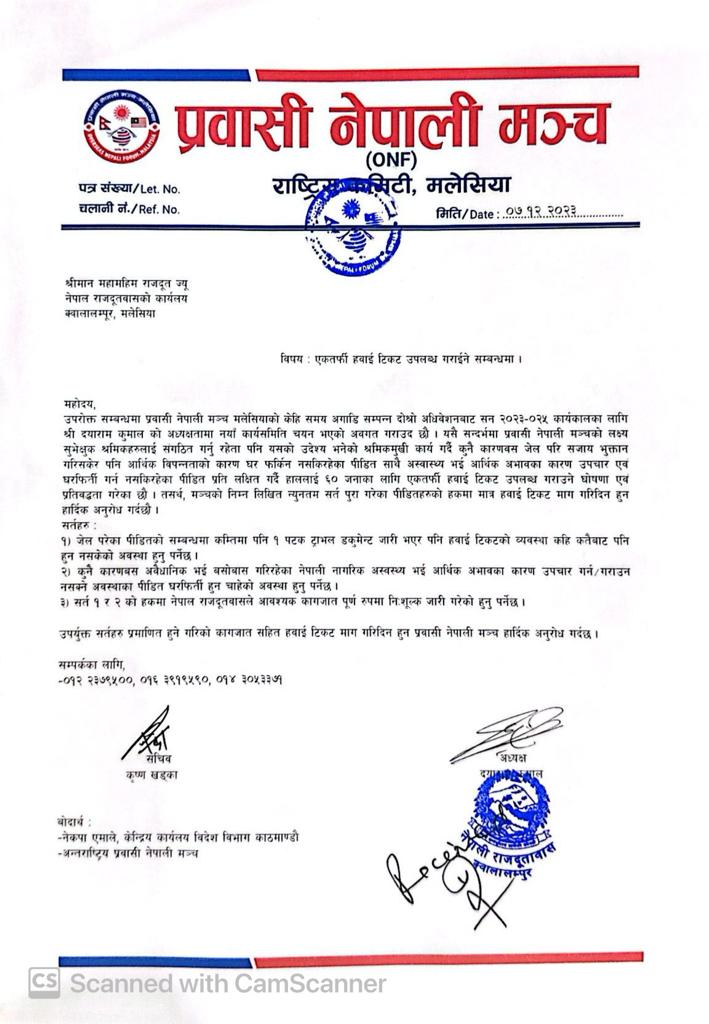 यस्तै प्रवासी नेपाली मञ्च मलेसियाका अध्यक्ष दयाराम कुमाल र सचिव कृष्ण खडकाको सयुक्त हस्ताक्षरमा प्रतिबद्धता जानकारी सहित मन्चले दुतावासलाई तिन बुँदे अनुरोध पत्रमा उल्लेख गरियका मागहरु यस्ता छन्।