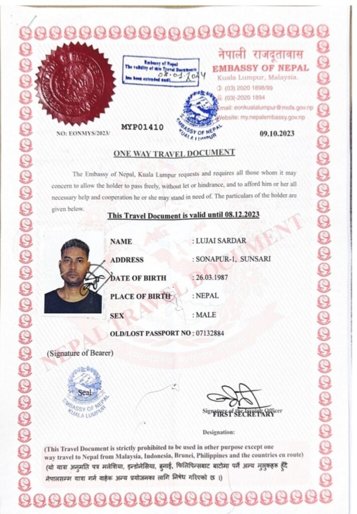 गैर आवासीय नेपाली संघ मलेसियाका युवा संयोजक राजु तामाङले पिडित सरदार लाई स्वदेश फिर्ता गर्नु पहिले ड्राइभ डकुमेन्ट दिदै