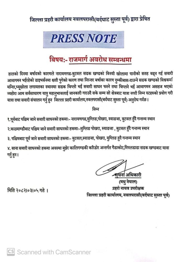 यस्तै बाटो चिप्लो र हिलो भएका कारण गाडीहरु फस्दा पनि समस्या हुने गरेको छ। त्यसैले जिल्ला प्रहरी कार्यालय, नवलपरासी (बर्दघाट सुस्ता पूर्व) ले बिहीबार सूचना जारी गर्दै यात्रुहरूलाई वैकल्पिक मार्ग प्रयोग गर्न आग्रह गरेको छ।