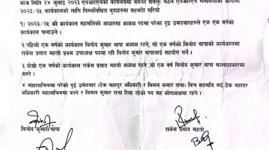 सहमति अनुसार पहिलो कार्यकाल बिनोद थापा र दोस्रो कार्यालय राकेश प्रसाद महतो ले अध्यक्ष पाउनुपर्ने थियो तर त्यसो भएन बिनोद थापाको पहिलो कार्यकाल समाप्त पछि महतो को कार्यकाल सुरु हुनुपर्नेमा विवाद सुरु भयो संघ दुई पक्षमा बिभाजन तर्फ उन्मुख हुदै गयो।