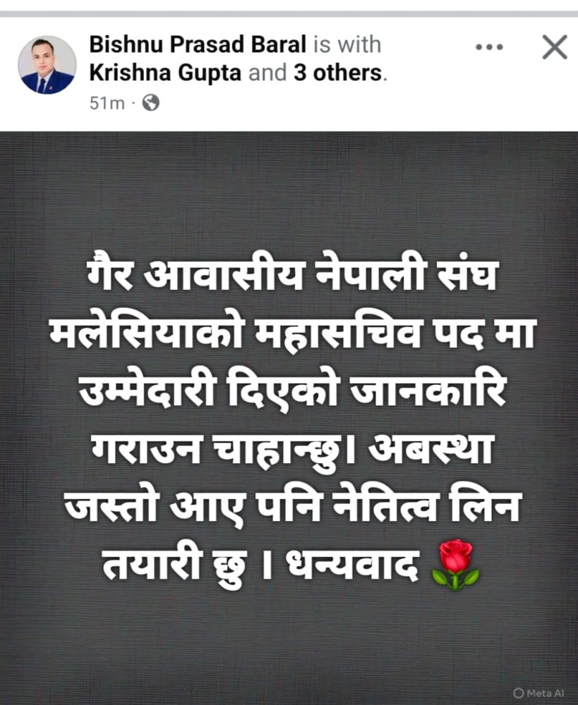 सामाजिक सञ्जालमार्फत सार्वजनिक गर्दै बरालले लेखेका छन्, “मलेसियाको महासचिव पदमा उम्मेदवारी दिएको जानकारी गराउन चाहन्छु। अवस्था जस्तो आए पनि नेतृत्व लिन तयारी छ। धन्यवाद भन्दै नेतृत्वको लागि तयार रहेको संकेत दिएका छन्।