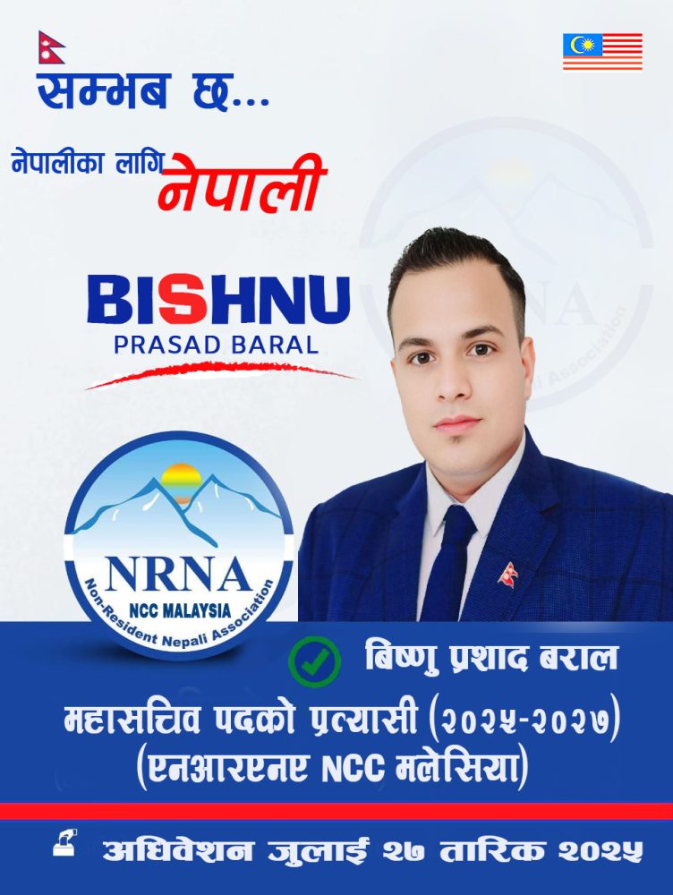 क्वालालम्पुर, गैरआवासीय नेपाली संघ (NRNA) मलेसियाको आगामी नवौं अधिवेशन (जुलाई २७, २०२५) नजिकिँदै गर्दा, महासचिव पदका लागि विष्णु प्रसाद बरालले आफ्नो उम्मेदवारी घोषणा गरेका छन्।