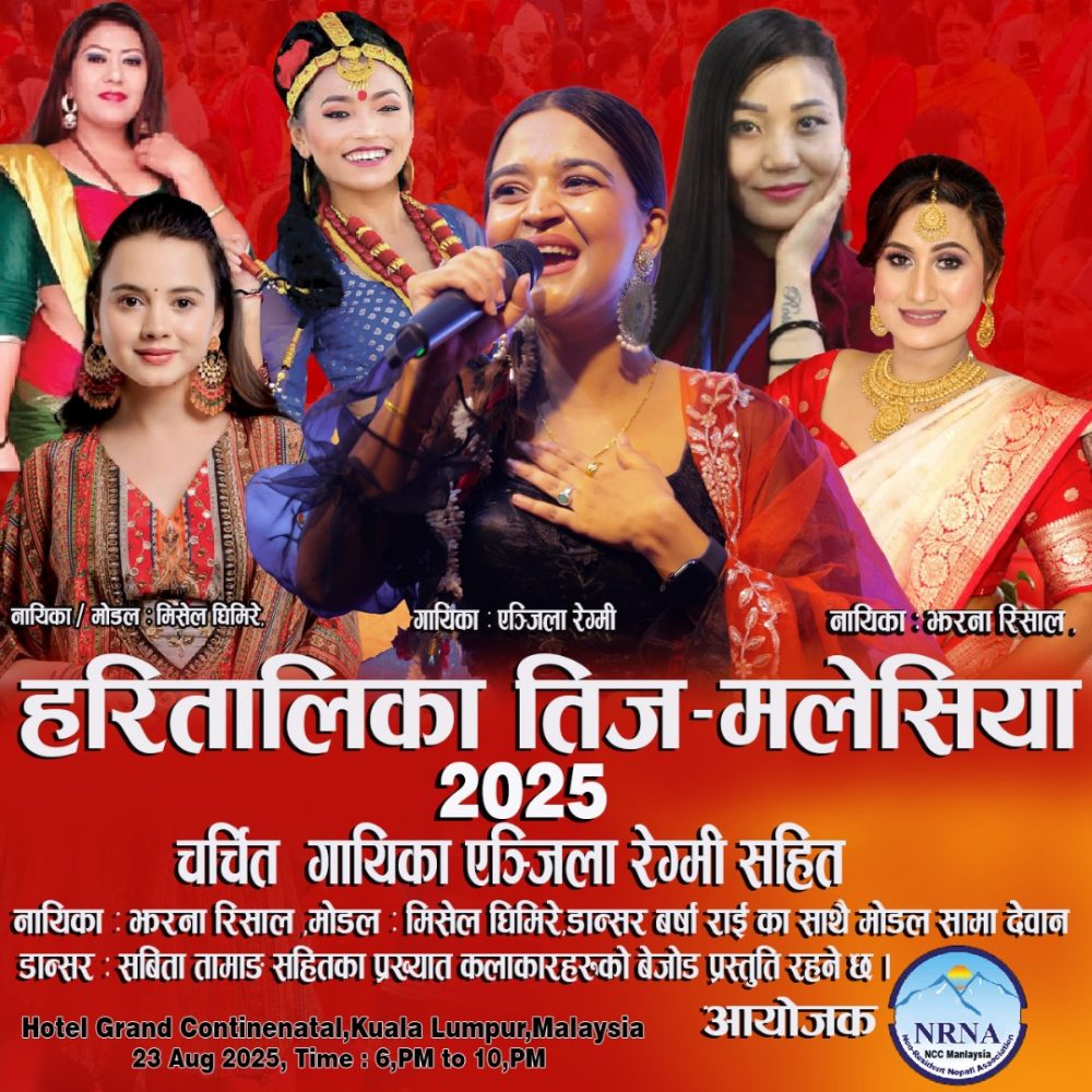 क्वालालम्पुर (मलेसिया) नेपाली समुदायको प्रमुख सांस्कृतिक पर्व हरितालिका तिज मलेसियामा विशेष कार्यक्रमसहित मनाउने तयारी गरिएको छ। आगामी २३ तारिख अगस्ट २०२५ (शनिबार) को दिन Hotel Grand Continental, Kuala Lumpur मा आयोजना हुने कार्यक्रममा नेपालका चर्चित कलाकारहरूको प्रस्तुति रहनेछ।