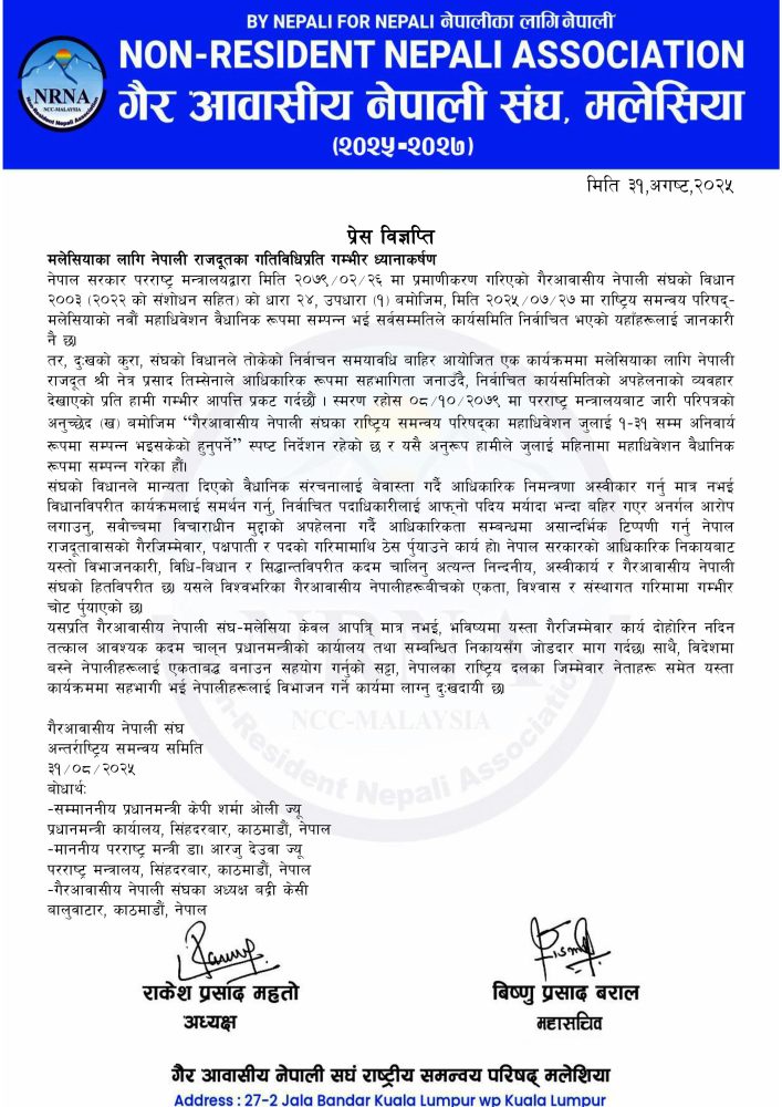 क्वालालम्पुर, मलेसिया – गैरआवासीय नेपाली संघ (एनआरएनए) मलेसियाले मलेसियाका लागि नेपाली राजदूत डा. नेत्र प्रसाद तिम्सेनाको हालैका गतिविधिप्रति गम्भीर आपत्ति जनाउँदै औपचारिक प्रेस विज्ञप्ति जारी गरेको छ।