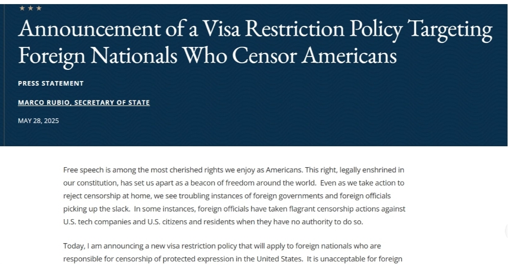 त्यति मात्र होइन, संयुक्त राज्य अमेरिकामा संरक्षित अभिव्यक्तिको सेन्सरसिपमा संलग्न विदेशी नागरिकहरू तथा सरकारी अधिकारीहरूमाथि नयाँ भिसा प्रतिबन्ध नीति लागू गर्ने कुरा उल्लेख गरेको छ ।