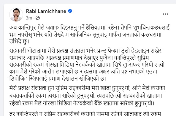 सहकारी घोटालामा मेरो प्रत्यक्ष संलग्नता भनेर फ्रन्ट पेजमा ठूलो हेडलाइन राखेर समाचार आएपछि अप्रत्यक्ष प्रमाणमात्र देखाएर पुग्दैन। कान्तिपुरले सुप्रिम सहकारीको रकम गोरखा मिडिया नेटवर्कको खातामा सिधै ट्रान्सफर गरियो र त्यो काम मैले गरेको आरोप लगाएको छ र त्यसमा अक्षर त्यति प्रष्ट नभएको एउटा डिपोजिट स्लिपलाई प्रमाण देखाउन खोजिएको छ।
