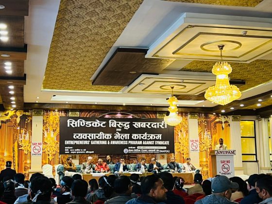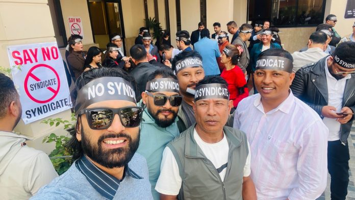 मलेसियाको रोजगारीमा बढ्दै गएको सिन्डिकेट प्रणाली विरुद्ध नेपाल वैदेशिक रोजगार व्यवसायी संघले मंगलबार राजधानीमा विशाल विरोध कार्यक्रम सम्पन्न गरेको छ। संघका सदस्यहरूले हात र निधारमा कालोपट्टी बाँध्दै ‘No Syndicate’ लेखिएको व्यानरसहित अनुपम फुडल्यान्ड, बत्तीसपुतलीमा भेला आयोजना गरेका हुन्।