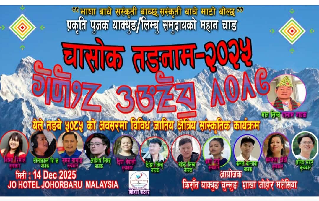 मलेसिया ! मलेसियामा रहेका लिम्बू समुदायले आफ्नो मौलिक सांस्कृतिक चाड चासोक तङनाम यस वर्ष पनि किराँत याक्थुङ चुम्लुङ क्षेत्रीय समिति, जोहोरको आयोजनामा विविध सांस्कृतिक कार्यक्रमसहित १४ डिसेम्बर २०२५ (आइतबार) मा भव्य रूपमा मनाउने भएको छ। कार्यक्रम जोहोर बारुस्थित JO Hotel मा आयोजना हुने छ।