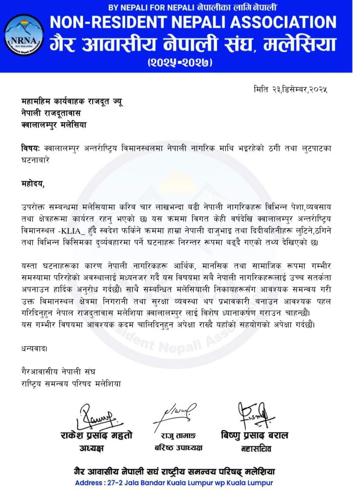 यसै विषयलाइ लिएर NRNA मलेसियाले यस्ता घटनाका कारण नेपाली नागरिकहरू आर्थिक, मानसिक तथा सामाजिक रूपमा गम्भीर समस्यामा परेको उल्लेख गर्दै सबै नेपालीलाई उच्च सतर्कता अपनाउन आग्रह गरेको छ। साथै संघले मलेसियाली सम्बन्धित निकायहरूसँग आवश्यक समन्वय गरी विमानस्थलमा सुरक्षा व्यवस्था मजबुत बनाउन माग समेत गरेको छ।