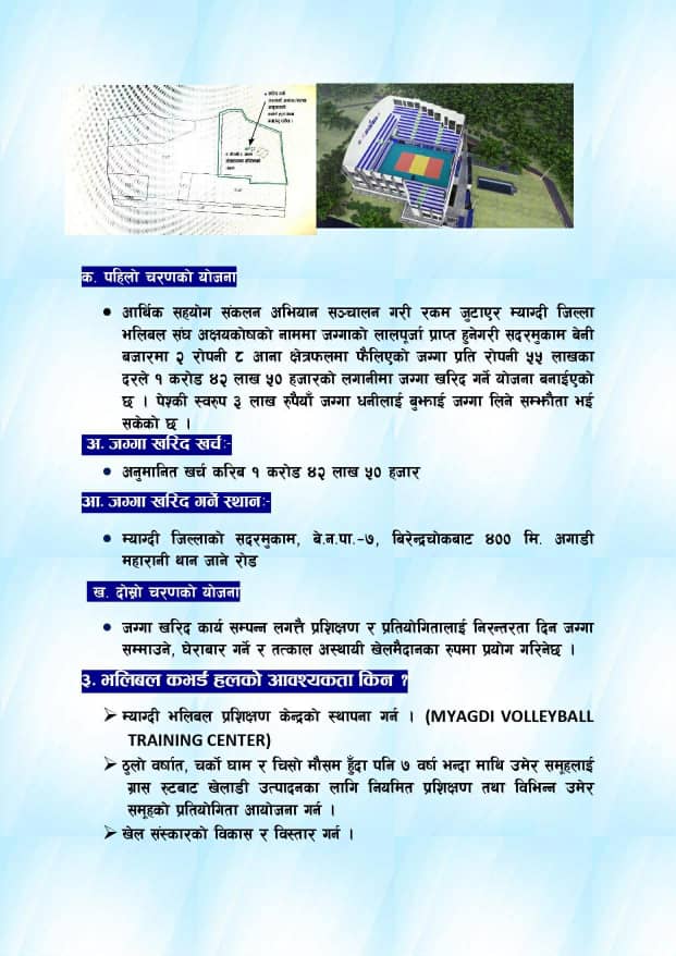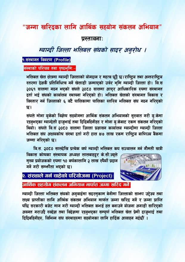 म्याग्दी । म्याग्दी जिल्लामा आधुनिक भलिबल कभर्ड हल निर्माण गर्ने उद्देश्यसहित म्याग्दी जिल्ला भलिबल संघले जग्गा खरिदका लागि आर्थिक सहयोग संकलन अभियान सुरु गरेको छ। “स्वास्थ्यका लागि खेलकुद, राष्ट्रका लागि खेलकुद” भन्ने राष्ट्रिय अभियानअनुसार संघले दीर्घकालीन खेल पूर्वाधार विकासलाई लक्ष्य बनाएको जनाएको छ।
