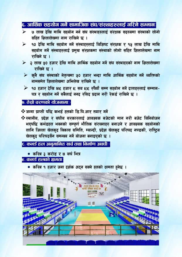 आर्थिक सहयोग गर्ने दाताहरूलाई योगदानको स्तरअनुसार सम्मान गर्ने व्यवस्था गरिएको छ। संघका अनुसार ५० हजारदेखि माथि सहयोग गर्ने व्यक्तिको नाम शिलालेखमा राखिने, ठूलो रकम सहयोग गर्ने दातालाई विशेष संरक्षकका रूपमा सम्मान गरिनेछ।