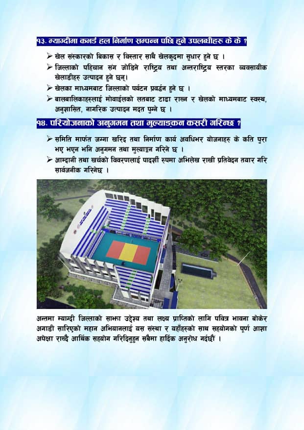 संघले म्याग्दी जिल्लाको समग्र खेलकुद विकास र भावी पुस्ताका लागि दिगो पूर्वाधार निर्माण गर्न सबैको साथ, सहयोग र ऐक्यबद्धताको आवश्यकता रहेको भन्दै सहयोगका लागि हार्दिक अनुरोध गरेको छ।