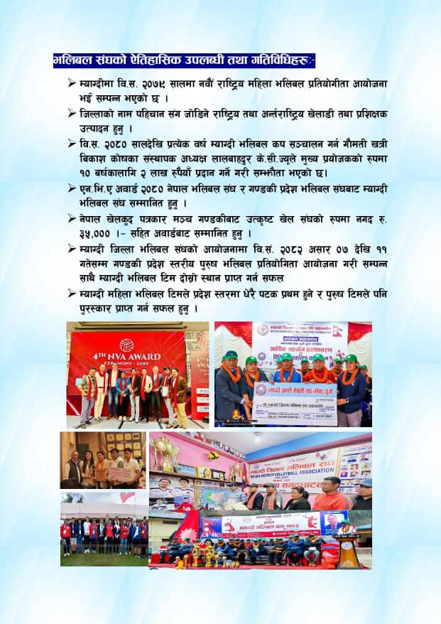 यसैबीच, म्याग्दी जिल्ला भलिबल संघले २०८२ साल पौष १५ गते बेनीमा आर्थिक सहयोग संकलन अभियानको औपचारिक शुभारम्भ कार्यक्रम आयोजना गरेको छ। कार्यक्रममा खेलकुद क्षेत्रका अगुवा, विभिन्न संघ–संस्थाका प्रतिनिधि तथा सरोकारवालाको उपस्थिति रहेको थियो।