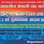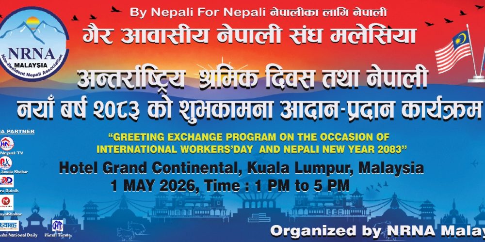क्वालालम्पुर । Non-Resident Nepali Association Malaysia ले अन्तर्राष्ट्रिय श्रमिक दिवस तथा नेपाली नयाँ वर्ष २०८३ को अवसरमा शुभकामना आदान–प्रदान कार्यक्रम आयोजना गर्ने भएको छ।