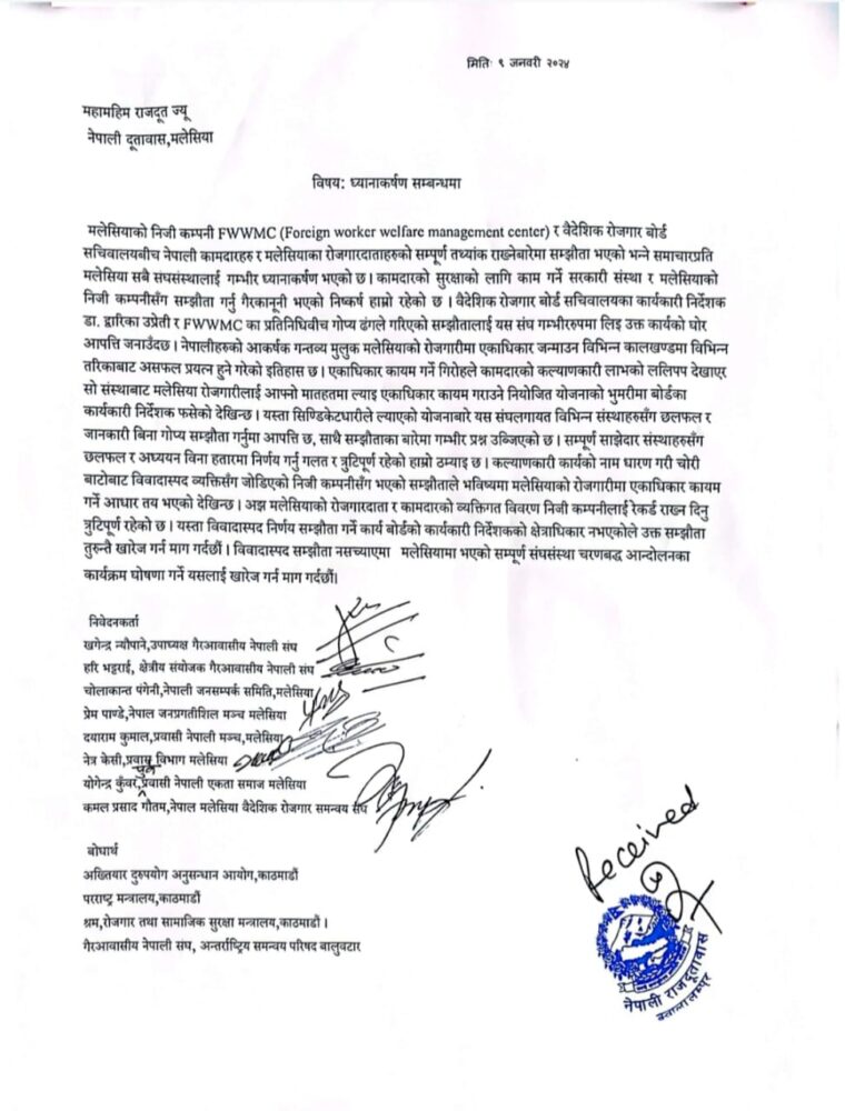 कामदारको हित र सुरक्षासंग सम्बन्धित काम हेर्न दिने नाममा मलेसियाको निजी कम्पनी ‘फरेन वर्कर्स वेलफेयर म्यानेजमेन्ट सेन्टर’ सँग सम्झौता र श्रम सम्झौता विपरीत प्रति नेपाली कामदार ४५ अमेरिकी डलर उठाउनेगरि एक निजी मलेसियन कम्पनीसँग सम्झौता बिषयमा मलेसियामा सङ्गठित राजनैनिक दल, संघ सस्थाका अगुवा, नेपाली म्यानपावर ब्यावसायी र एनआरएनएले संयुक्त रुपमा दूतावासमा ज्ञापनपत्र बुझाउदै ध्यानाकर्षण गराएका थिए ।